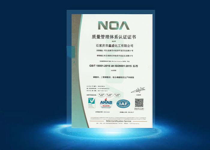 I prodotti di Xinsheng Chemical sono ben venduti in Cina e all'estero con il marchio Meiyu. I suoi prodotti di esportazione includono principalmente la serie di fosfato di zinco,Serie di tripolifosfato di alluminio e serie di fosfato di alluminio,che sono ampiamente utilizzati in vernici anticorrosive per ferrovie, automobili, navi, ecc. Xinsheng Chemical ha una capacità annua di 1200 tonnellate di serie di fosfato di zinco,720 tonnellate di serie di tripolifosfato di alluminioI prodotti sono conformi agli standard nazionali, alla registrazione REACH, ai requisiti ROHS, ai test SG e al sistema di certificazione ISO9001.